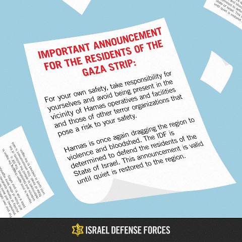 2:28 PM IDF dropped flyers earlier today over Gaza. The following translation from the Arabic is from the IDF Spox: